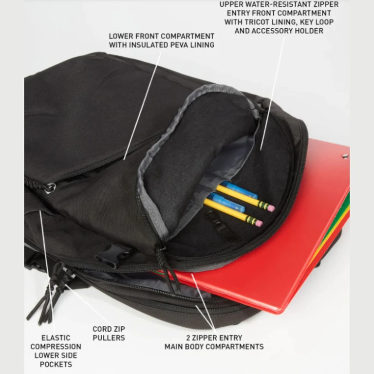 ארבעה תאים מאפשרים אחסון ייעודי עבור דברים גדולים וקטנים, יש גם כיסי צד אלסטיים לבקבוקי מים וכדומה.